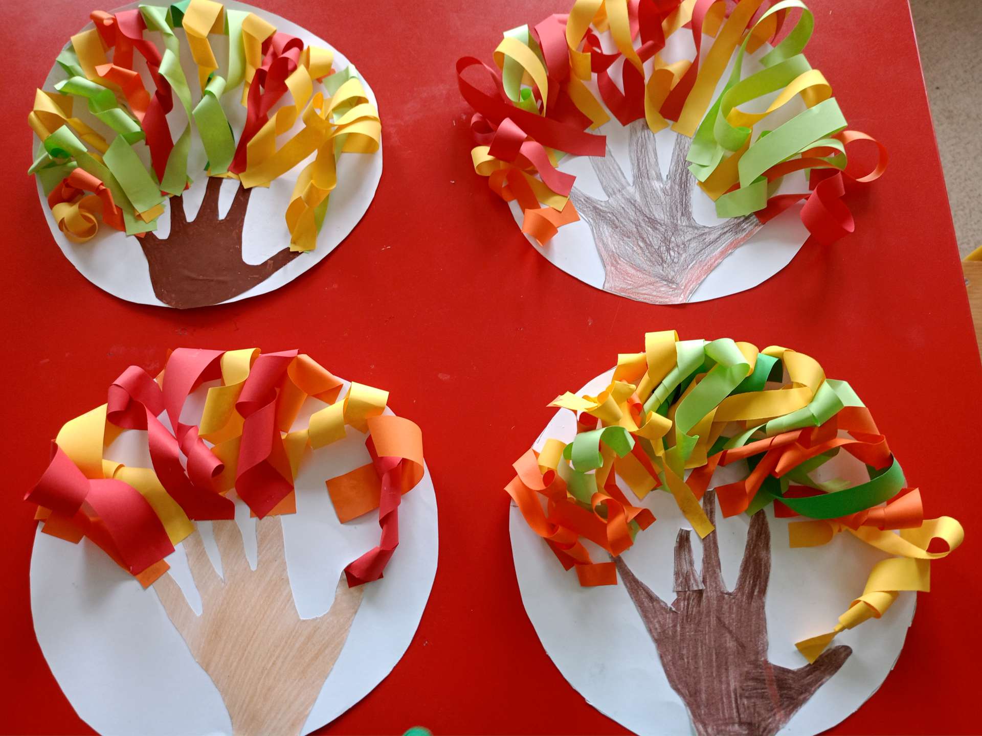 Jesień już powoli pokazuje swoją gorszą wietrzną, deszczową stronę. W taką pogodę świetliczaki pozostają w szkole, gdyż o kilkugodzinnym pobycie na dworze można już zapomnieć. Planem awaryjnym jest zapewnienie dzieciom różnorodnych aktywności. Dziś nadeszła pora na jesienne drzewa. Bazę ( pień drzewa) został stworzony z dziecięcych odrysowanych dłoni, które zostały pomalowane na brązowo, wycięte i naklejone na koło z białego bloku technicznego. Następnie z kolorowych kartek wycinany paski, które następnie zostały doklejane do konarów drzewa ( paluszków).